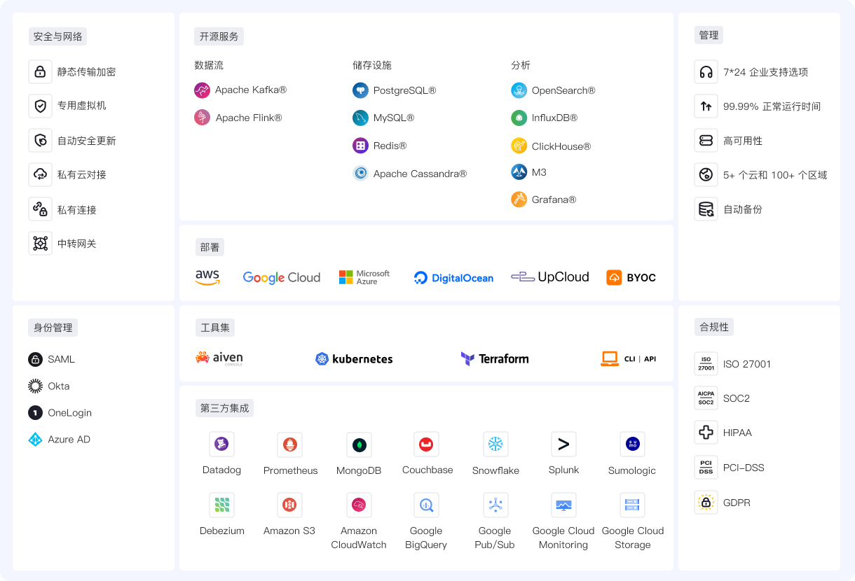 Aiven 的一体化云数据平台结合了所有连接到您使用的数据服务所需的工具,支持所有主要的云服务提供商。