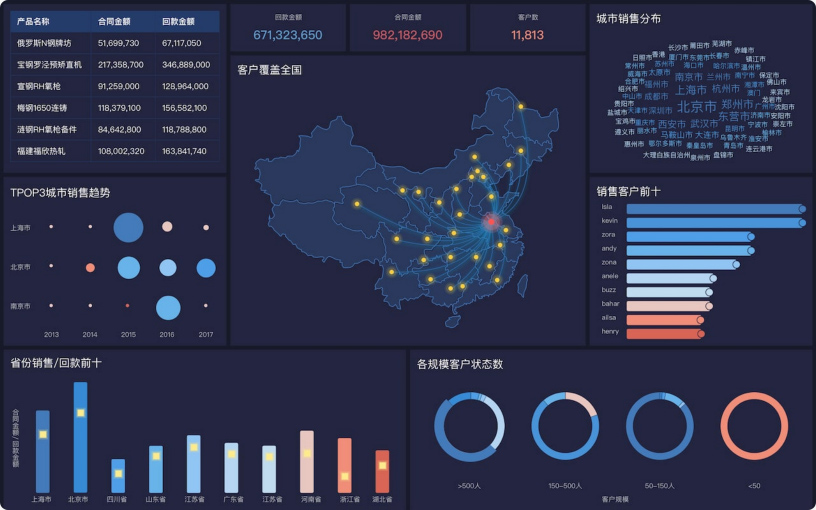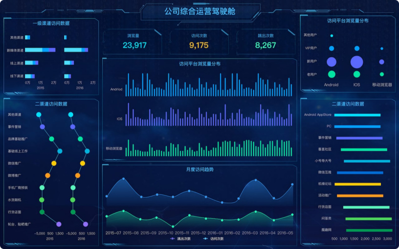 运营人员可以通过可视化化大屏的形式直观展示公司业务的关键指标,有助于从全局层面加深对业务的理解与思考,做到让数据驱动运营。