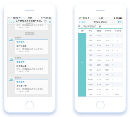 中梁地产选择钉钉集成帆软 Html5 报表的方式进行数据分析管理,借助钉钉的消息界面每天推送领导最为关心的三张报表,分别为签约达成、去化分析、回款达成,推送后,报表的每日访问量大幅提升,优化管理,有效提升IT部门的价值。