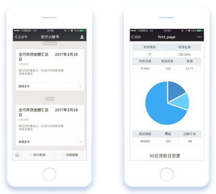 南通农商行利用帆软移动平台与微信的集成,搭建了微信小秘书、高管小秘书和机关小秘书。针对不同层级领导,微信定时推送数据分析结果。分析结果支持在线图表预览,领导不开电脑只用手机一样能及时查看到业务进展状况。