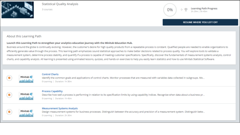 这就是为何 Minitab 创建自定进度的在线学习路径来配合资源和培训。员工将使用与他们所用工具一致且用当地语言编写的资料,按照自己的节奏学习。 真实世界的示例和练习为每节课提供了有价值的环境。用户学习知识并赢得信心,将其新技能直接应用于自己在工作中面临的挑战。通过专家打造的评估,确保您的员工正在学习的资料可帮助他们更好更高效地完成工作。