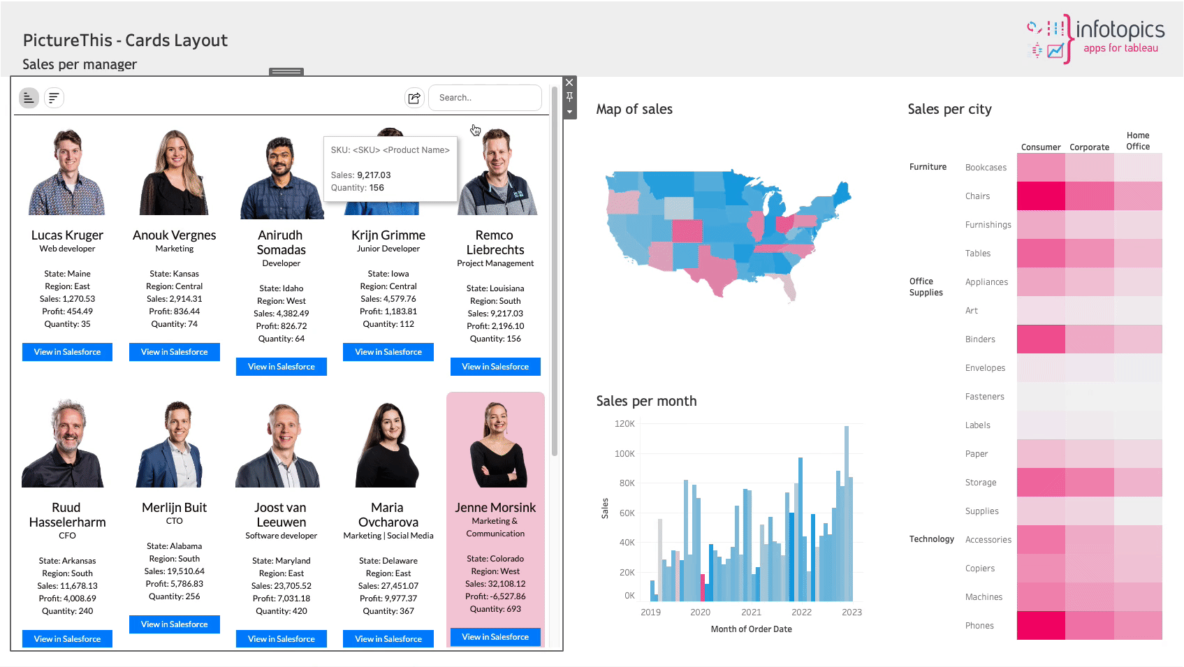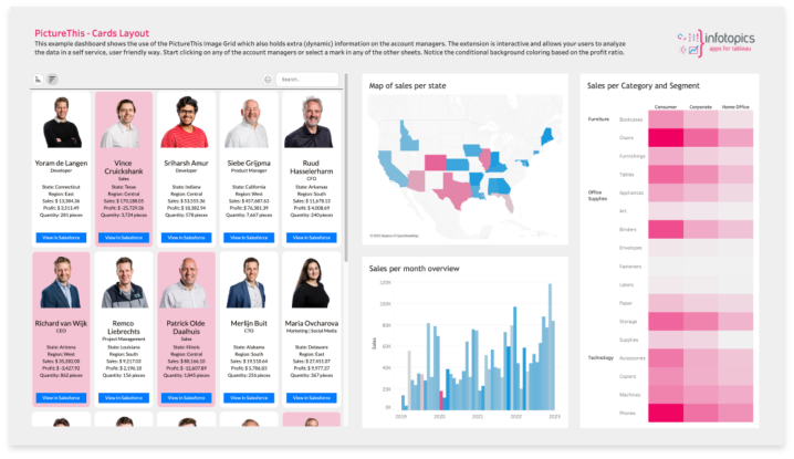 您是否曾经尝试过在Tableau Dashboard中使用产品或同事图像而不是名称作为过滤器?Tableau提供URL操作、背景图像和形状,以便在仪表板中使用图片。这需要大量的工作来准备好所有的图像,以便以标准的方式在仪表板中使用。此外,它们仍然保持静态或低分辨率元素,使工作簿的大小变大。